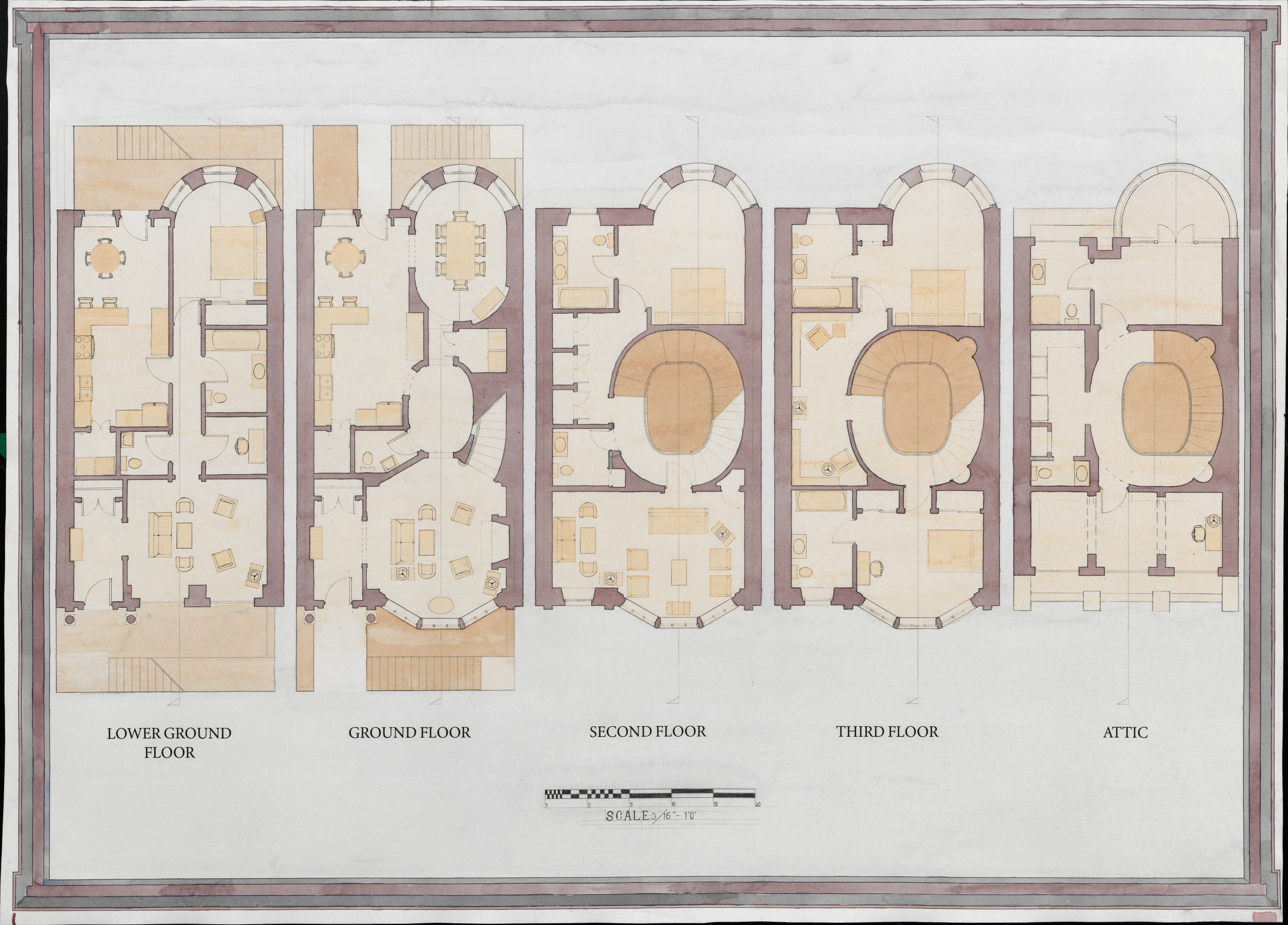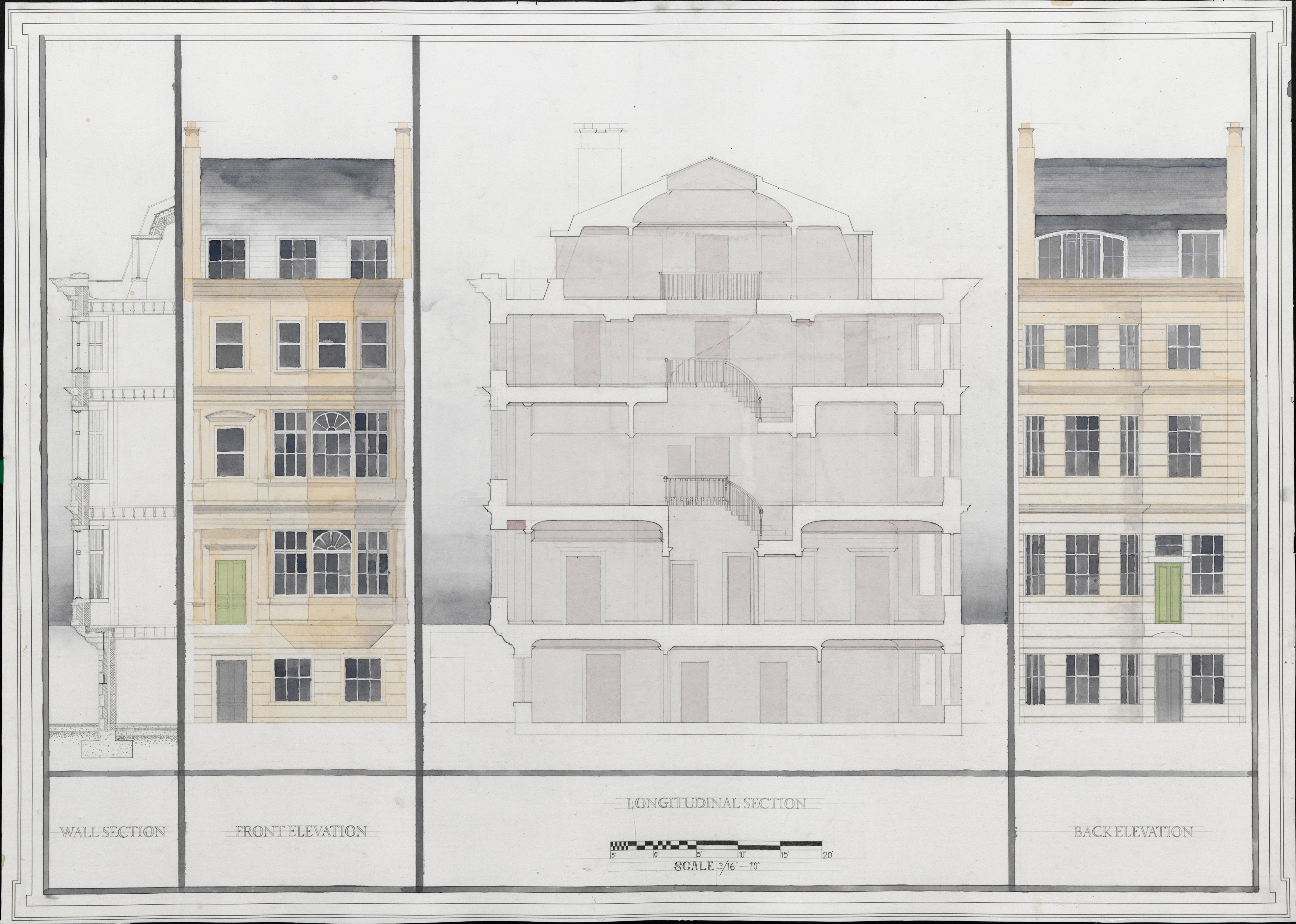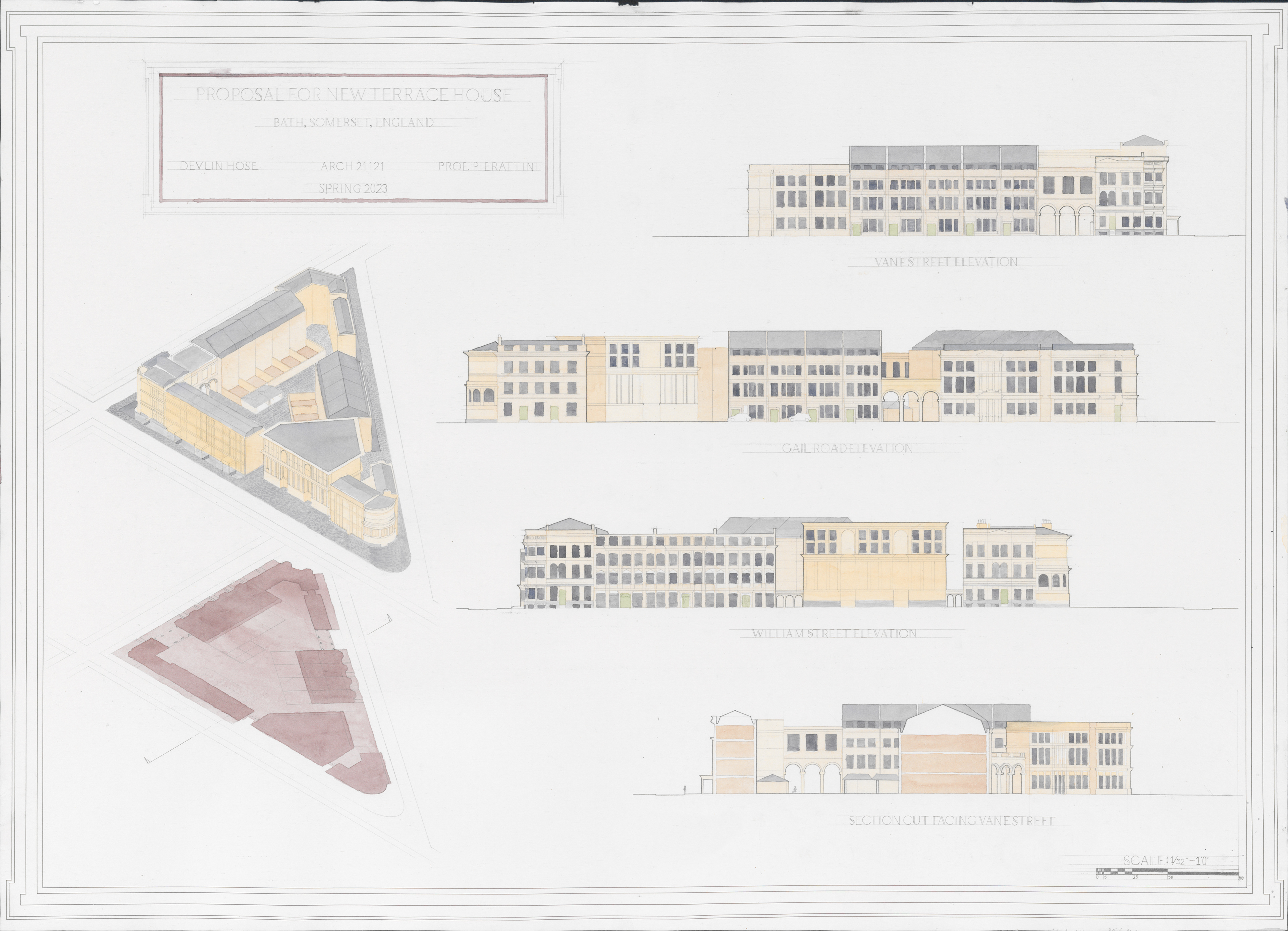 For this project in Design II, I was tasked with designing a new terrace townhouse for Bath, England. As part of the project I looked at precedent, the weather, situational themes and vernacular architecture to best express the pre-existing language in my proposed design. A slight change was the emphasis on the vertical element of the grand spiral staircase which calls attention to the skylight imbuing the internal core with daylight.